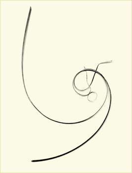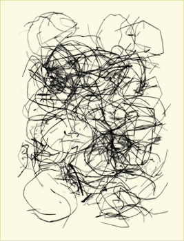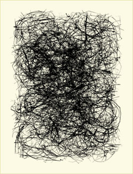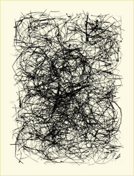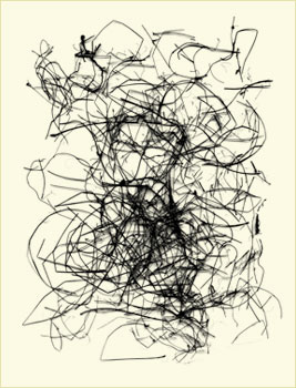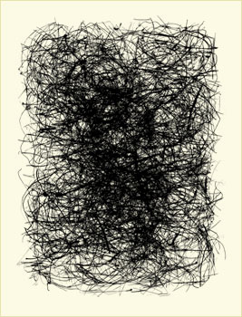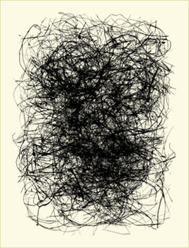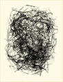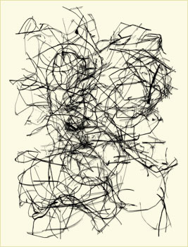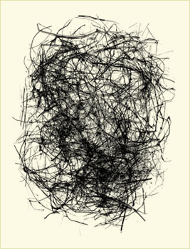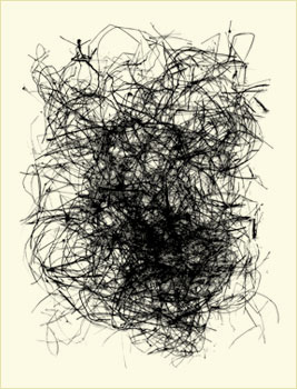 West develops these calligraphic forms from a collection of abandoned bird nests which he carefully takes apart, reassembling the bits of material on a scanner and making a digital file, often reworking the image to achieve the right composition.