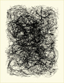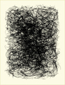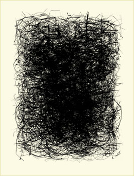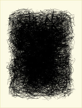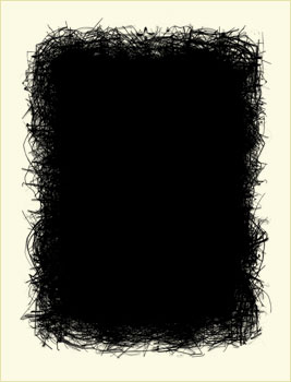 Says West, "Initially, I photographed the nests in their entirety, as they were found. After studying these pictures, I realized that they did not tell me anything more than what I already knew about the object. So, I began pulling apart the nests and placing the fibers on a digital scanner in order to look closely at their contents. My interest quickly changed from the object to the movement of the woven lines. I then began layering one composition over another, resulting with a dense black core in the final image."